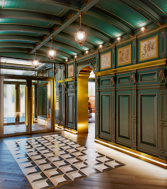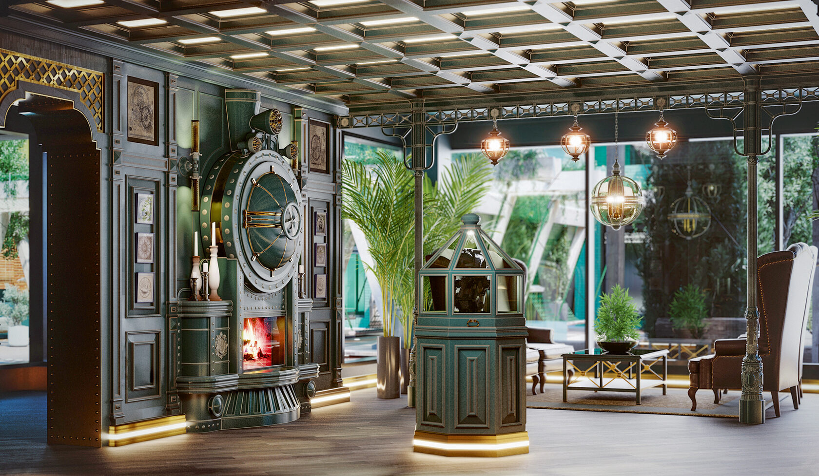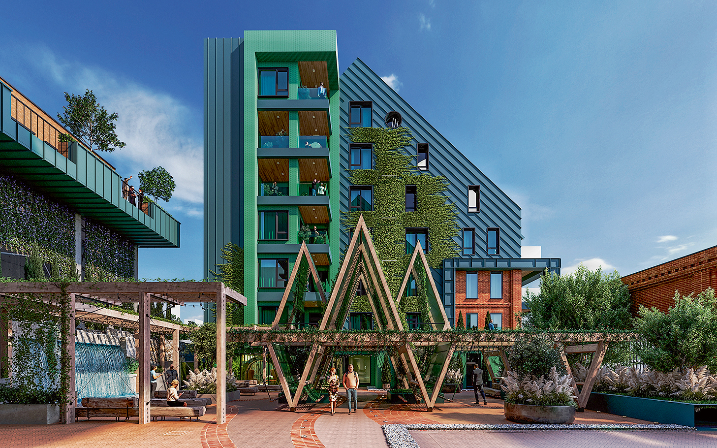 Закрытый зеленый двор «Артефакта» скрыт от городской суеты. Внутри — сад с большими деревьями, уличный камин, естественный водопад, уютные навесы. Все это превращает внутреннее пространство в приватный курорт. Жителей встречает одноэтажное строение с моллированными стеклами единой стойки ресепшн, а за ним — дизайнерское лобби с консьерж-сервисом. Это стильный акцент, который подчеркивает атмосферу клуба.