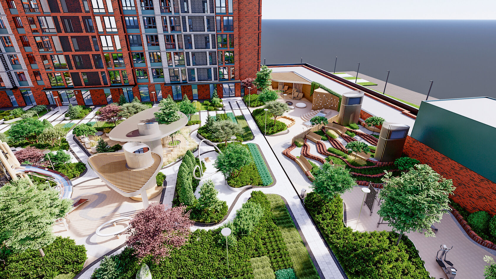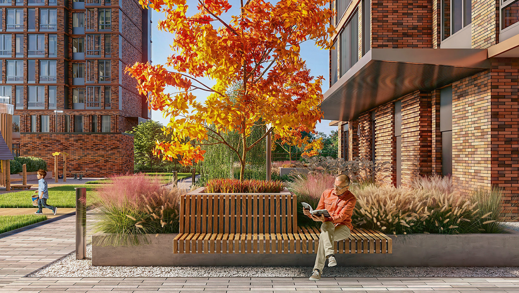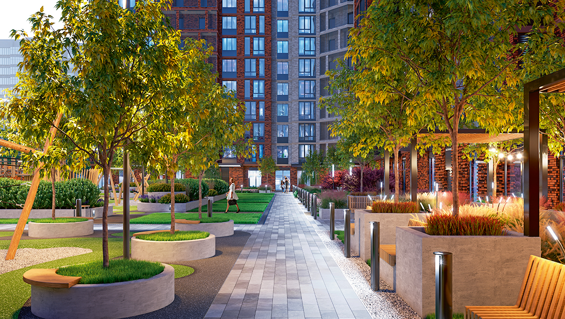 Двор-сад без машин наполнен светом и зеленью. Здесь всесезонное озеленение, амфитеатр для встреч и праздников, спортивные кластеры и детские площадки. Атмосферу дополняет система интеллектуального освещения, которая мягко меняется от заката до рассвета. Для владельцев предусмотрен подземный паркинг с зарядками для электромобилей и кладовыми.